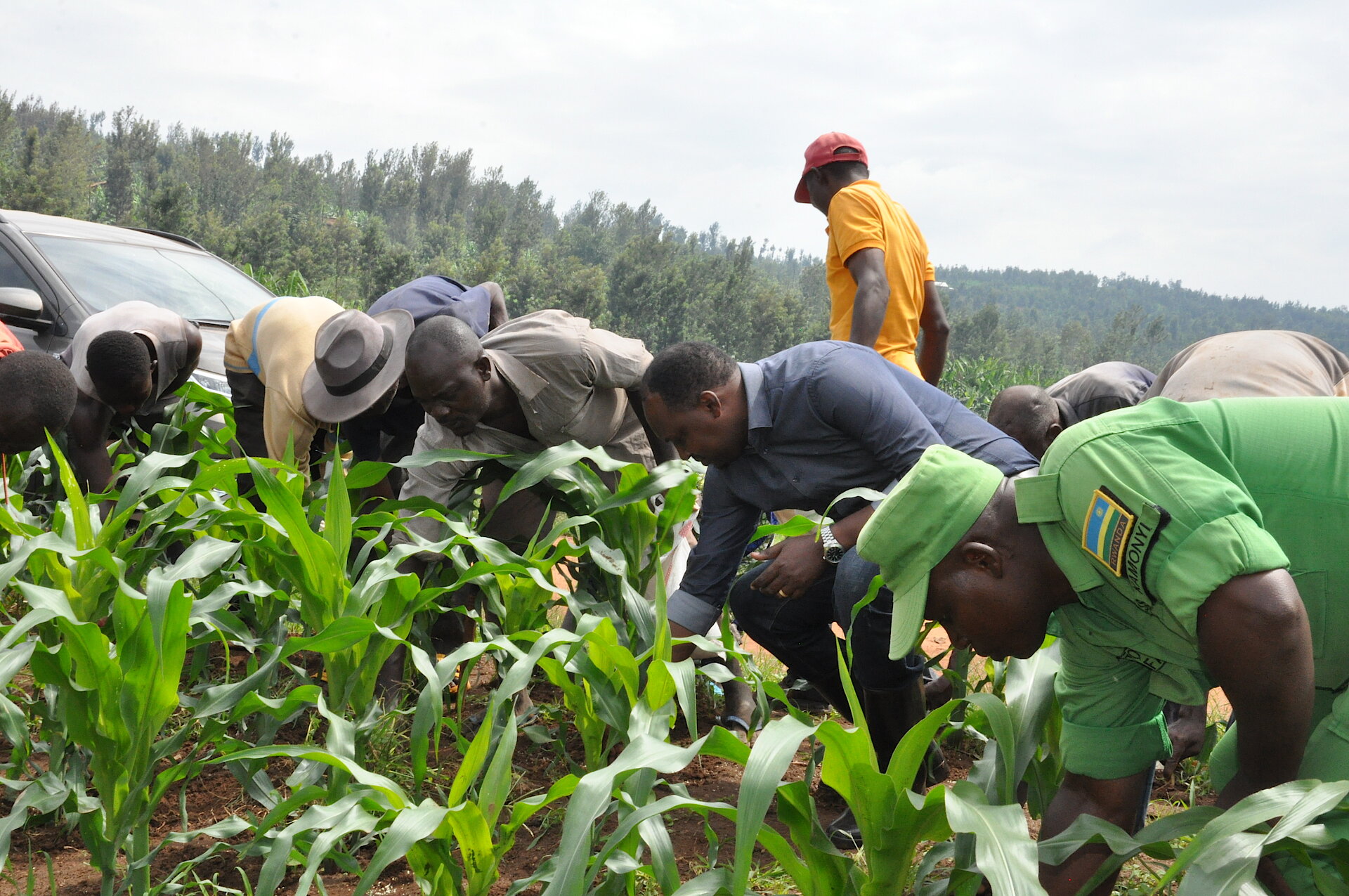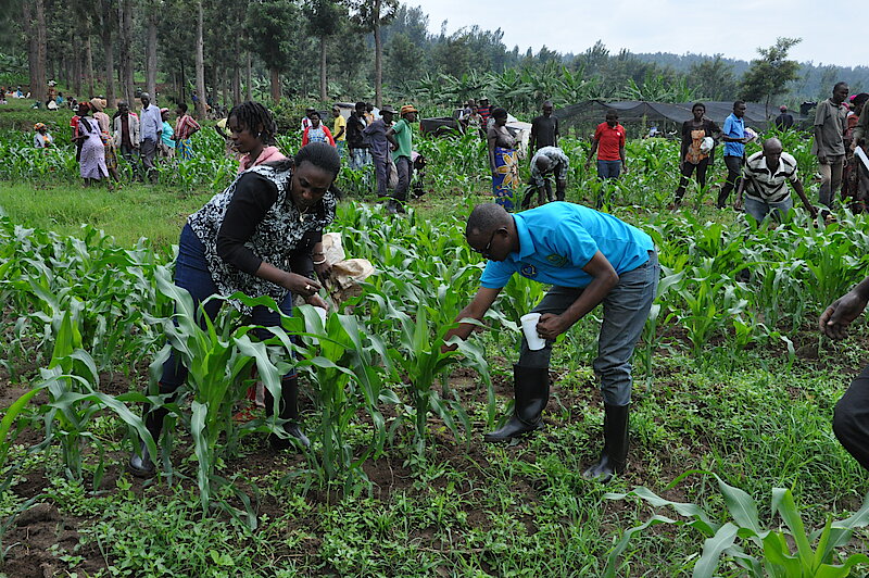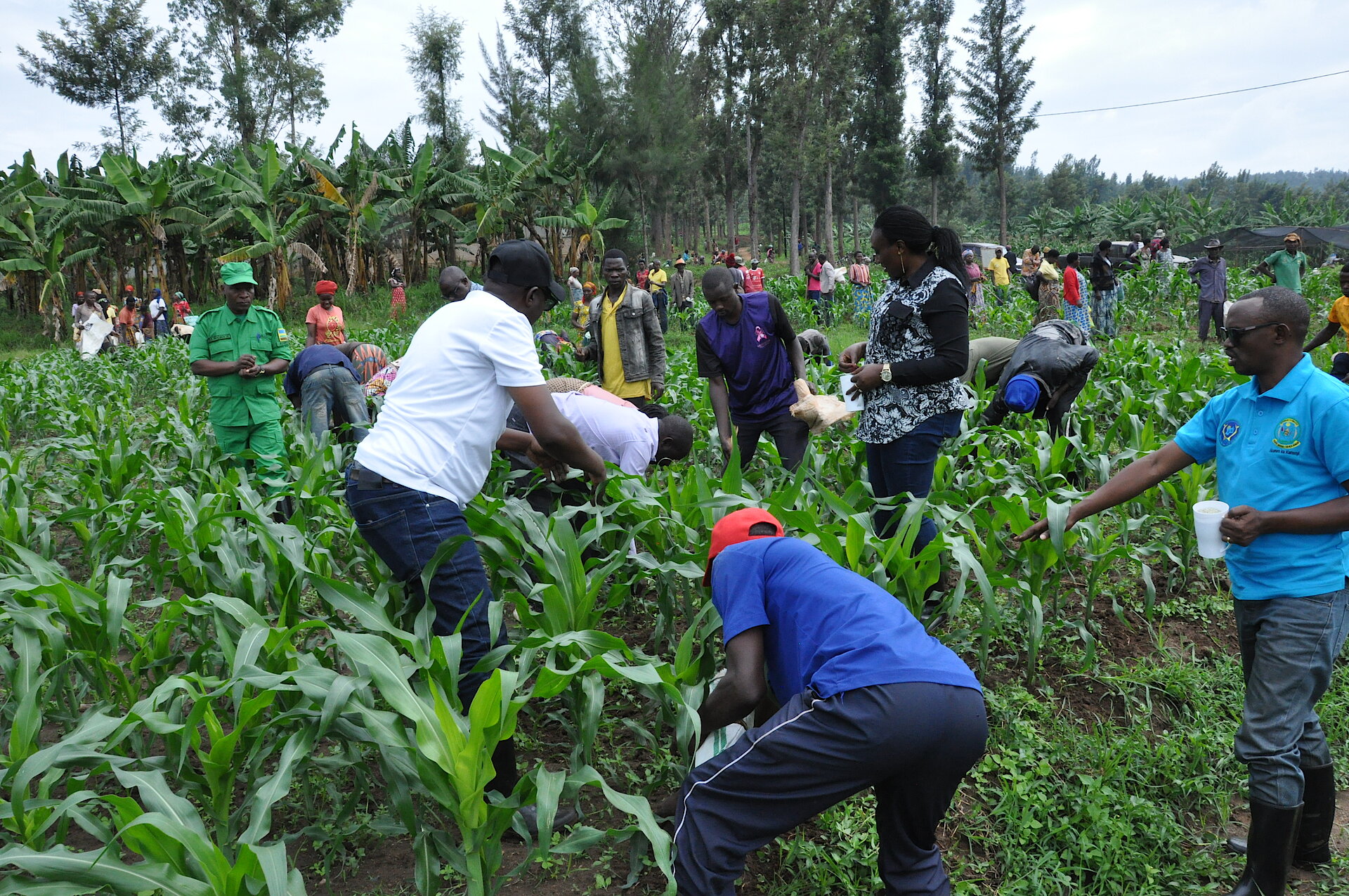 Guverineri w’Intara y’Amajyepfo Mme KAYITESI Alice hamwe n’itsinda ryaturutse ku Karere riyobwe na Visi Meya Ushinzwe Ubukungu bwana NIYONGIRA Uzziel n'abahagarariye inzego z'umutekano bafatanyije n’abaturage gutera ifumbire mu gihingwa cy’ibigori.