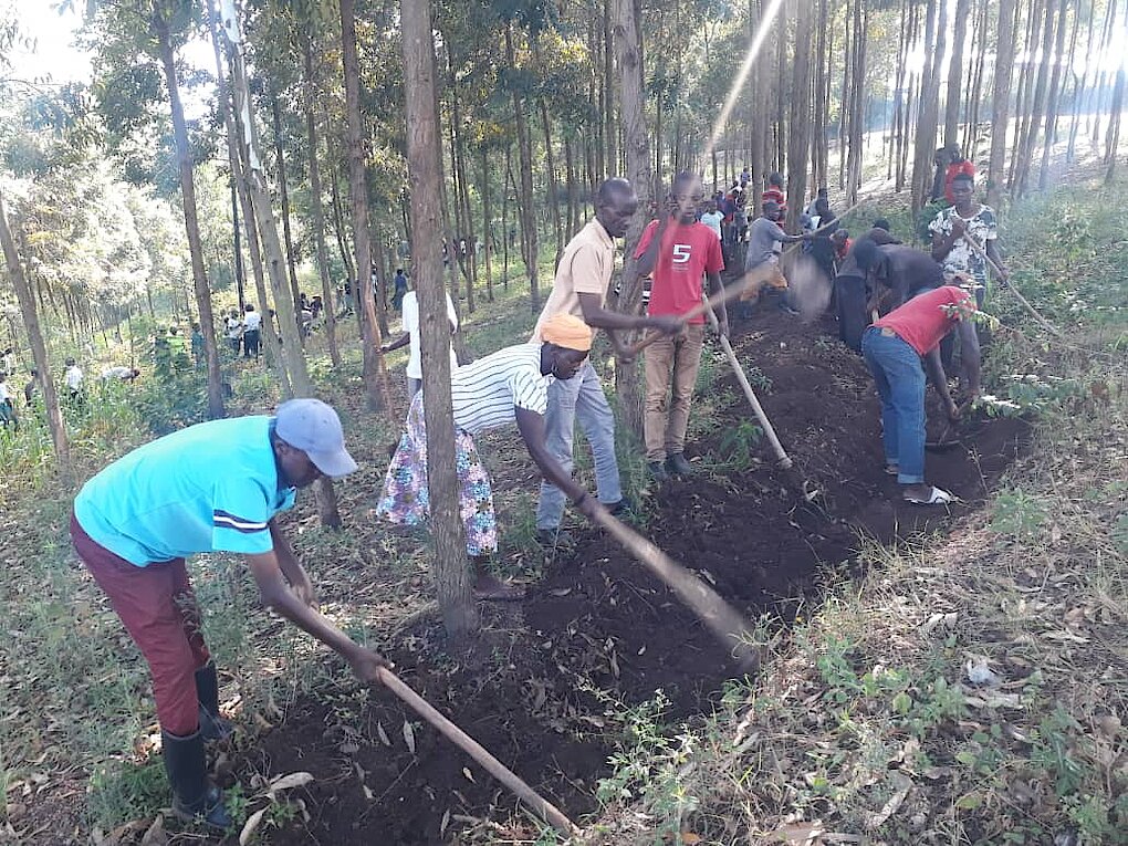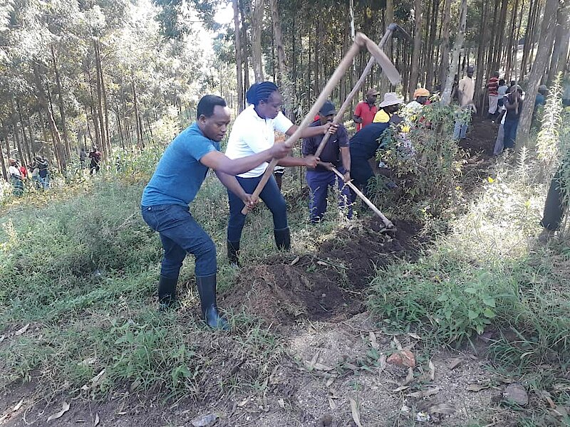Umuyobozi w'Akarere Dr. NAHAYO Sylvere ari kumwe na VM Ushinzwe Imibereho Myiza Mme UWIRINGIRA Marie Josée, Umunyamabanga Nshingwabikorwa w'Akarere bwana ABIYINGOMA Gerard, bifatanyije n'abaturage b'i Kigese mu Mudugudu wa Bikamba mu Murenge wa RUGALIKA mu muganda wo gukumira ibiza bakaba bacukuye imirwanyasuri ku musozi wa Bikamba uteyeho ishyamba rya santarali gaturika ya Masaka.